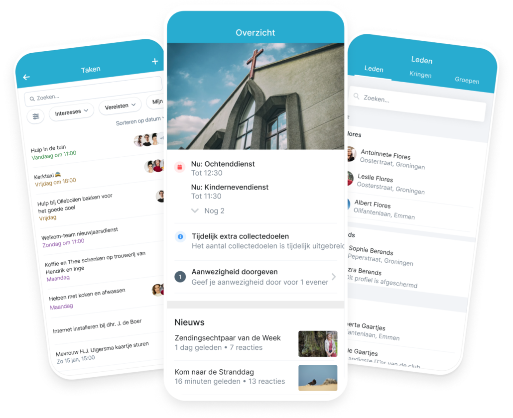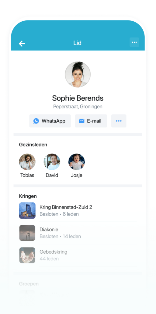 De ledenlijst is meer dan een lijst met namen of een smoelenboek. Het volgt gezinsstructuren en toont gezinshoofden. Is uw kerk georganiseerd in wijken, kringen of andere groepen? Dan zijn deze eenvoudig terug te vinden in de app.