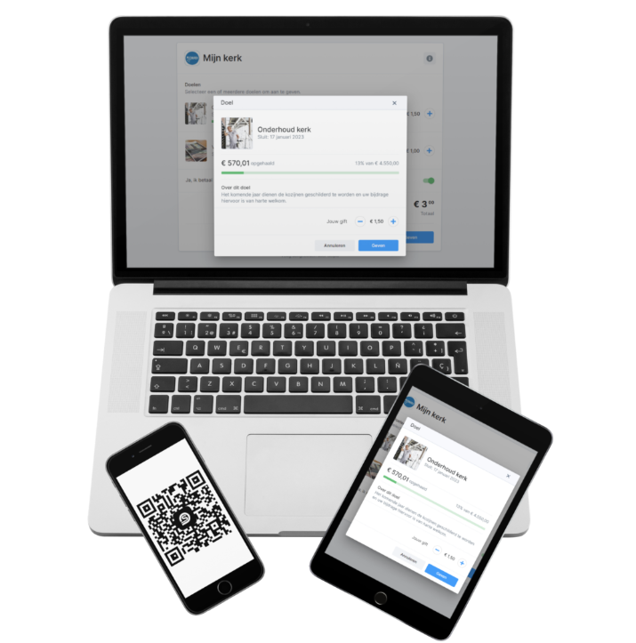 Direct op de betaalpagina komen, zelfs als je de Scipio App niet hebt geïnstalleerd? Dat kan met behulp van de QR-code. Deze QR-code kan bijvoorbeeld tijdens een kerkdienst op een scherm worden geprojecteerd, of onderdeel zijn van een flyer/nieuwsbrief. Wanneer de code wordt gescand met de smartphone, opent de betaalpagina met daarop het overzicht van alle beschikbare collectedoelen. Per doel kan een bedrag worden gegeven. Dit kan vervolgens als één totaalbedrag worden afgerekend via iDEAL.